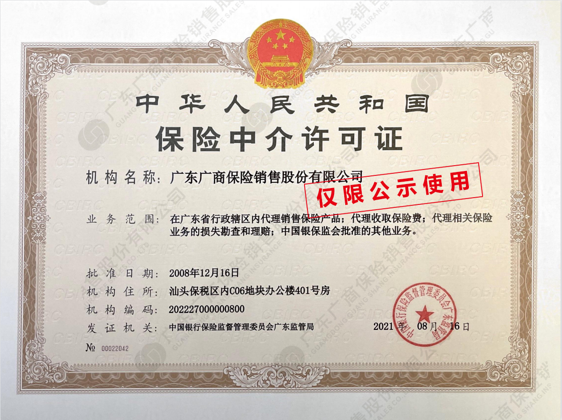 根據(jù)中國(guó)銀行保險(xiǎn)監(jiān)督管理委員會(huì)的規(guī)定,廣東廣商保險(xiǎn)銷(xiāo)售股份有限公司因經(jīng)營(yíng)場(chǎng)所變更換證,已由中國(guó)銀行保險(xiǎn)監(jiān)督管理委員會(huì)廣東監(jiān)管局換發(fā)新的《保險(xiǎn)中介許可證》,現(xiàn)予以公告。